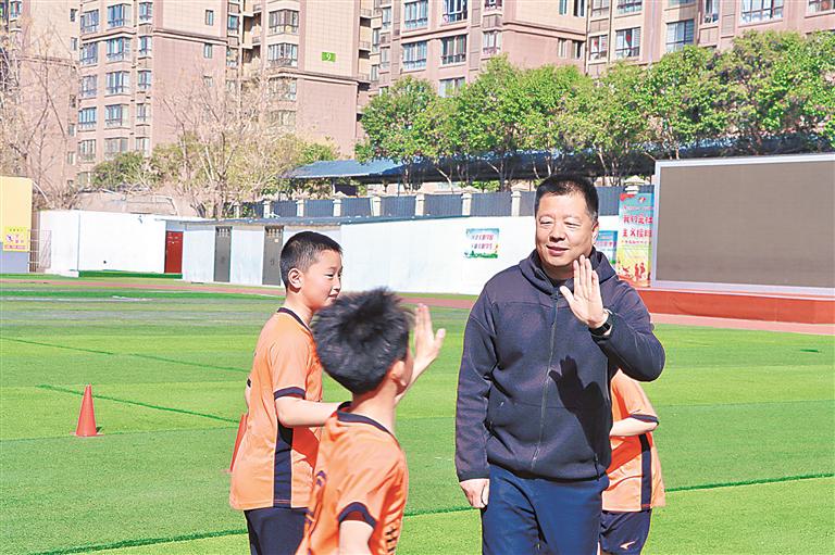 足球场上,黎朋与学生击掌,为他加油鼓劲。本报记者 周思文 摄