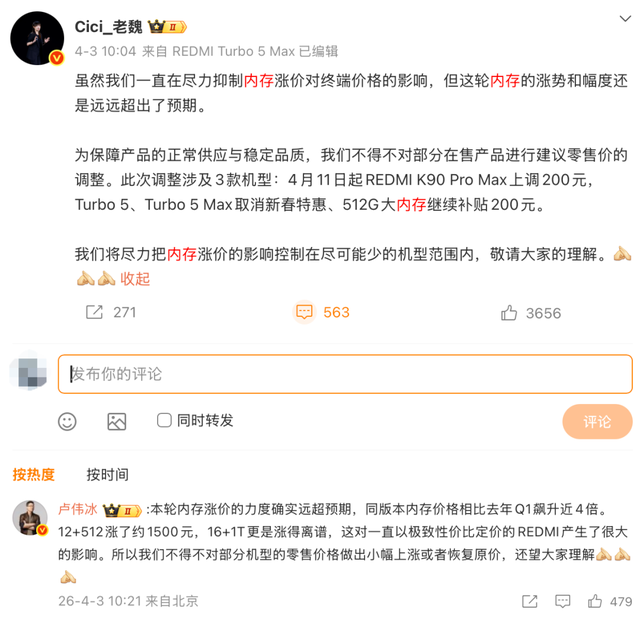 但这并非完全是厂商主动为之。前不久,小米中国区市场部总经理魏思琪在个人微博表示,公司此前已采取多种措施对冲内存涨价带来的终端定价压力,但此次内存价格的上涨幅度与持续态势,远超企业前期的预判,已超出可控范围。
